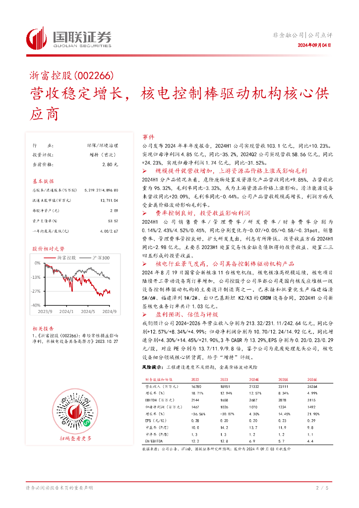 国联证券:浙富控股(002266)-营收稳定增长,核电控制棒驱动机构核心供应商.pdf