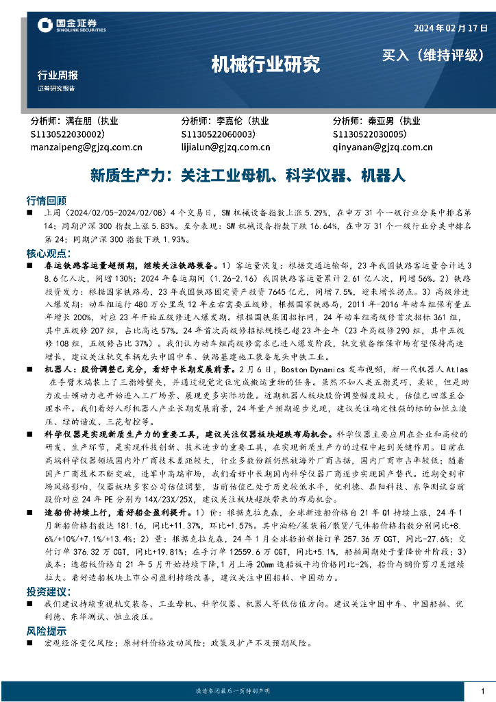 国金证券:机械行业周报-新质生产力:关注工业母机、科学仪器、机器人.pdf