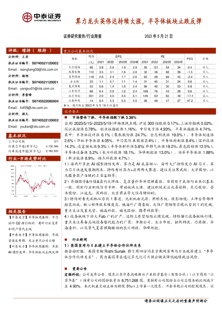 中泰证券:半导体行业周报:算力龙头英伟达持续大涨,半导体板块止跌反弹.pdf