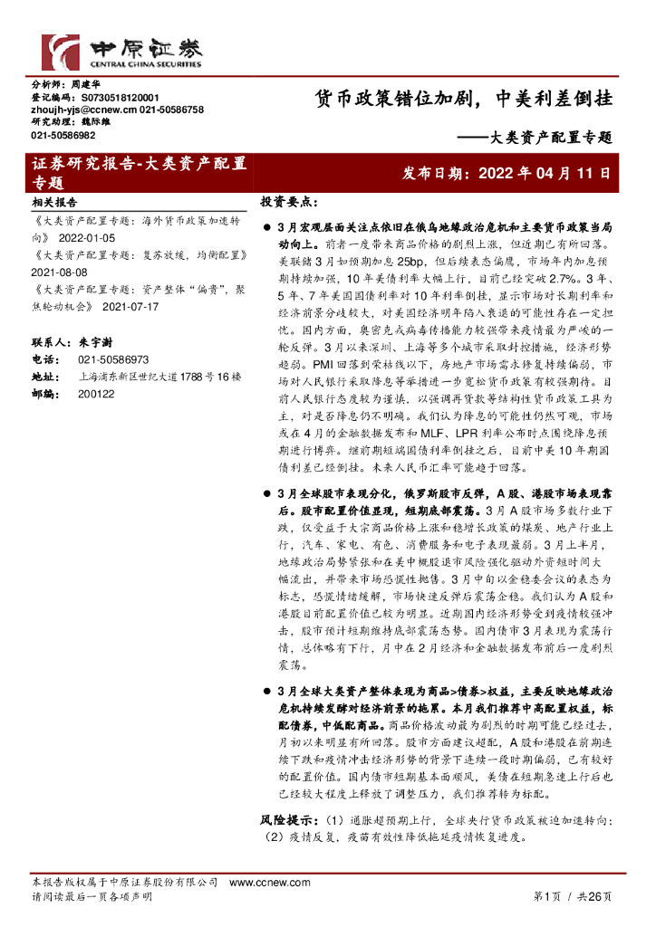 中原证券:大类资产配置专题:货币政策错位加剧,中美利差倒挂.pdf