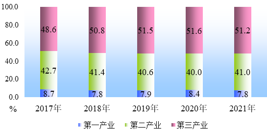 初步核算,2021年全省生产总值[2]42959.2亿元,比上年增长8.3%,两年平均增长6%。三次产业协同发展,第一产业增加值3360.6亿元,增长7.4%;第二产业增加值17613.2亿元,增长7.9%,其中工业增加值13081.7亿元、增长8.9%,制造业增加值11354.1亿元,占全省生产总值比重为26.4%、比上年提升0.6个百分点;第三产业增加值21985.4亿元,增长8.7%[3]。三次产业结构由上年的8.4:40.0:51.6调整为7.8:41.0:51.2。预计全年全员劳动生产率132467元/人,比上年增加15463元/人[4]。按常住人口计算,人均地区生产总值70321元(折合10900美元),比上年增加7910元。