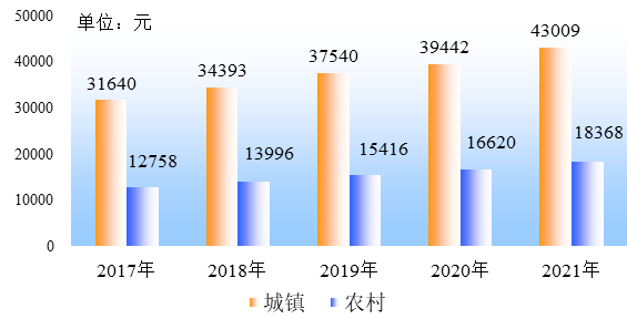按常住地分,城镇常住居民人均可支配收入43009元,增长9%,扣除价格因素实际增长8%。人均消费支出26495元,增长16.8%。其中,食品烟酒支出增长14.4%,衣着支出增长15.9%,居住支出增长8.9%,生活用品及服务支出增长23%,交通和通信支出增长13.7%,教育文化娱乐支出增长38.9%,医疗保健支出增长15.5%。城镇常住居民恩格尔系数为32%,比上年下降0.6个百分点。年末城镇常住居民人均住房建筑面积42.3平方米,比上年末增加0.2平方米。