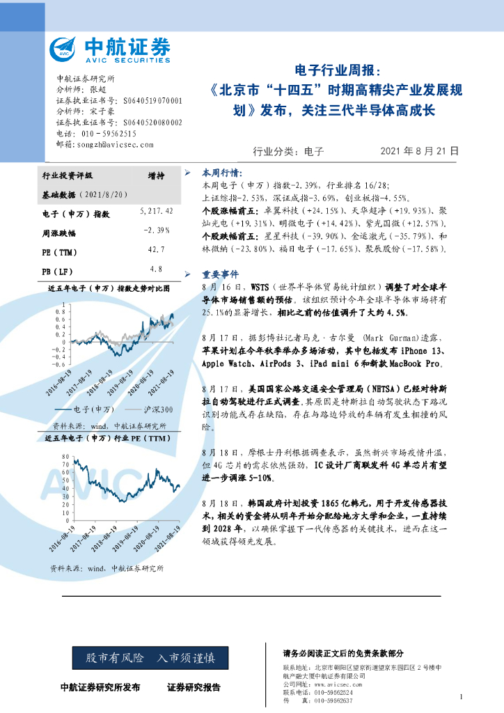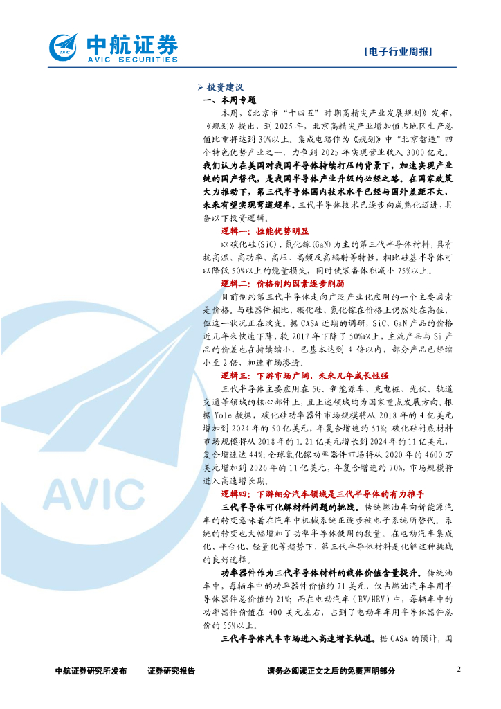 中航证券:电子行业周报:《北京市“十四五”时期高精尖产业发展规划》发布,关注三代半导体高成长.pdf