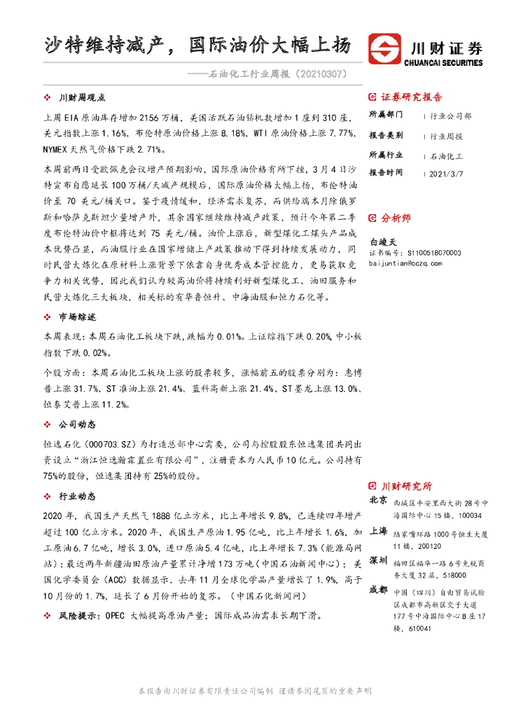 川财证券:石油化工行业周报:沙特维持减产,国际油价大幅上扬.pdf