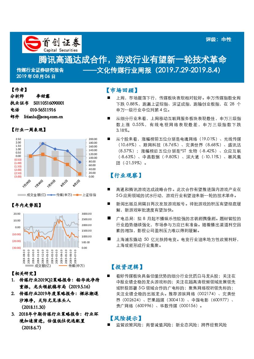 首创证券:文化传媒行业周报:腾讯高通达成合作,游戏行业有望新一轮技术革命.pdf