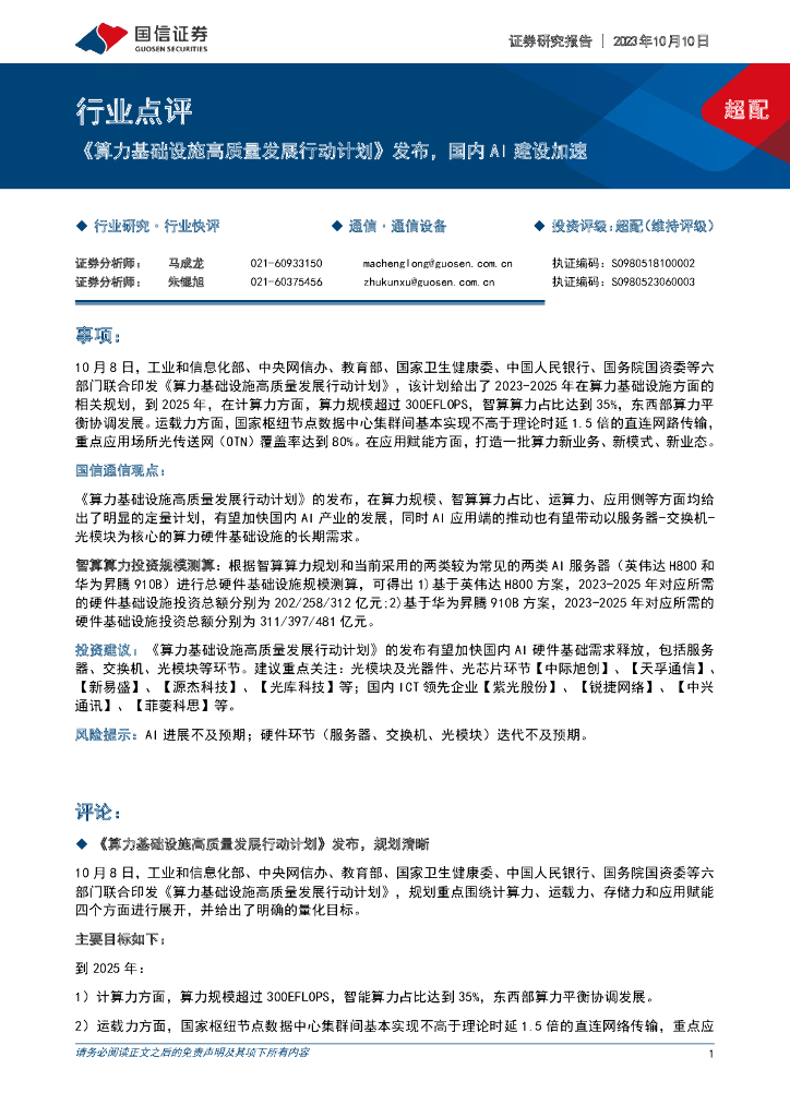国信证券:通信行业点评:《算力基础设施高质量发展行动计划》发布,国内AI建设加速.pdf