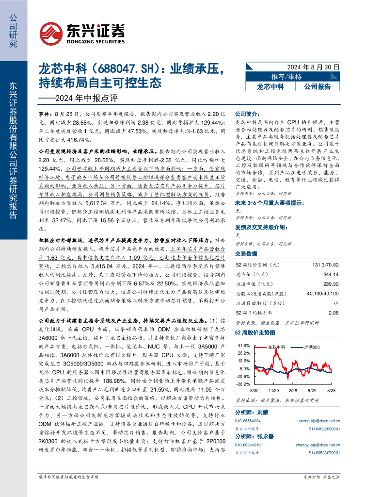 东兴证券:龙芯中科(688047)-2024年中报点评:业绩承压,持续布局自主可控生态.pdf