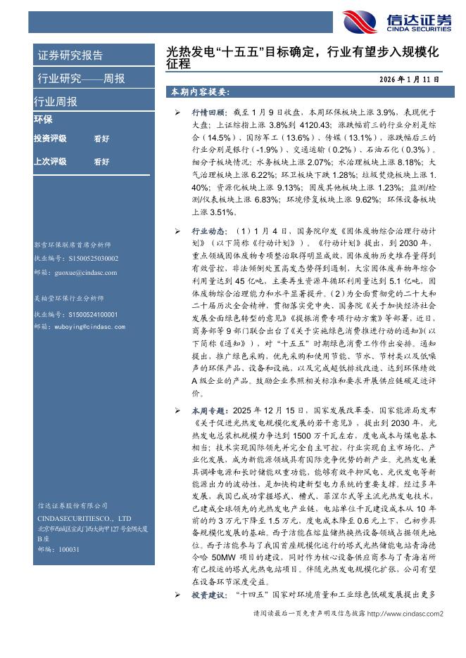 信达证券:环保行业周报:光热发电“十五五”目标确定,行业有望步入规模化征程.pdf