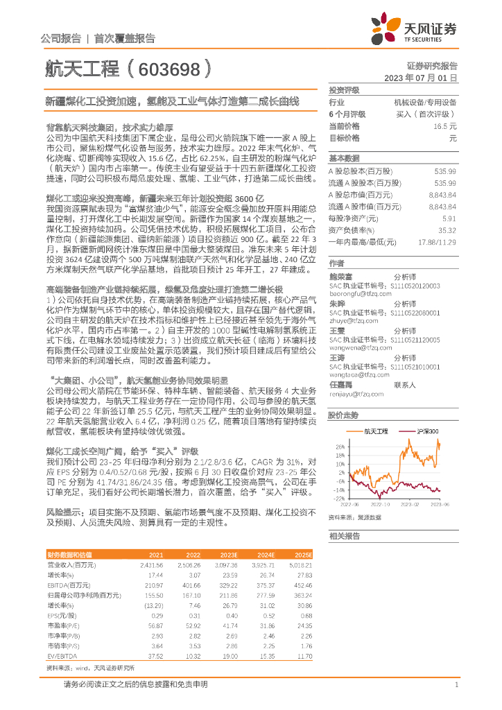 天风证券:航天工程(603698)-新疆煤化工投资加速,氢能及工业气体打造第二成长曲线.pdf
