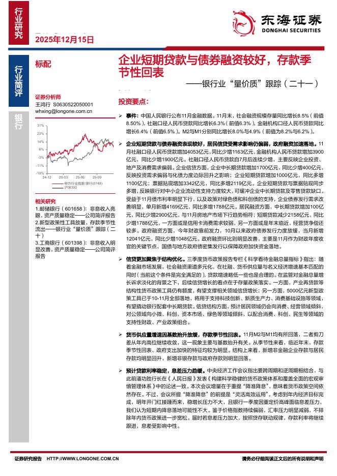 东海证券:银行业“量价质”跟踪(二十一):企业短期贷款与债券融资较好,存款季节性回表.pdf