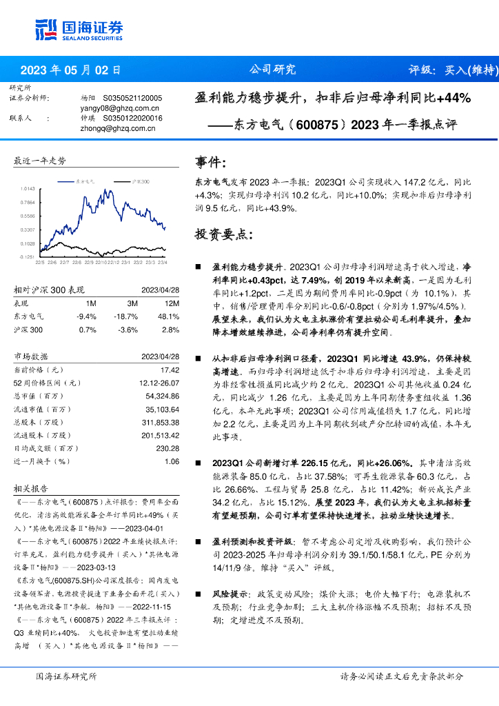 国海证券:东方电气(600875)-2023年一季报点评:盈利能力稳步提升,扣非后归母净利同比+44%.pdf
