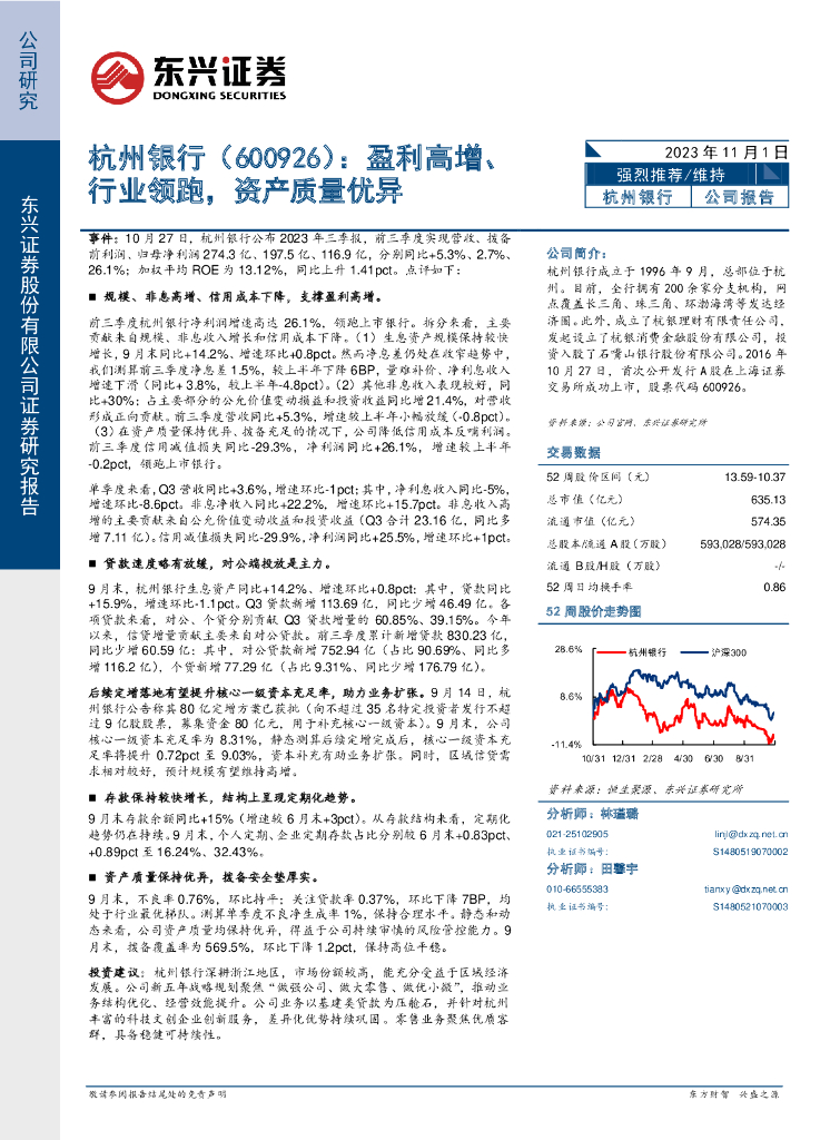东兴证券:杭州银行(600926)-盈利高增、行业领跑,资产质量优异.pdf