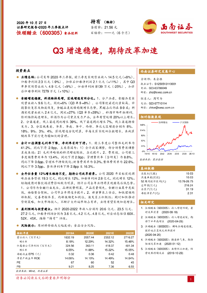 西南证券:恒顺醋业(600305)-Q3增速稳健,期待改革加速.pdf