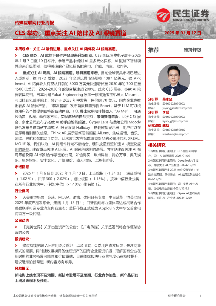 民生证券:传媒互联网行业周报:CES举办,重点关注AI陪伴及AI眼镜赛道.pdf