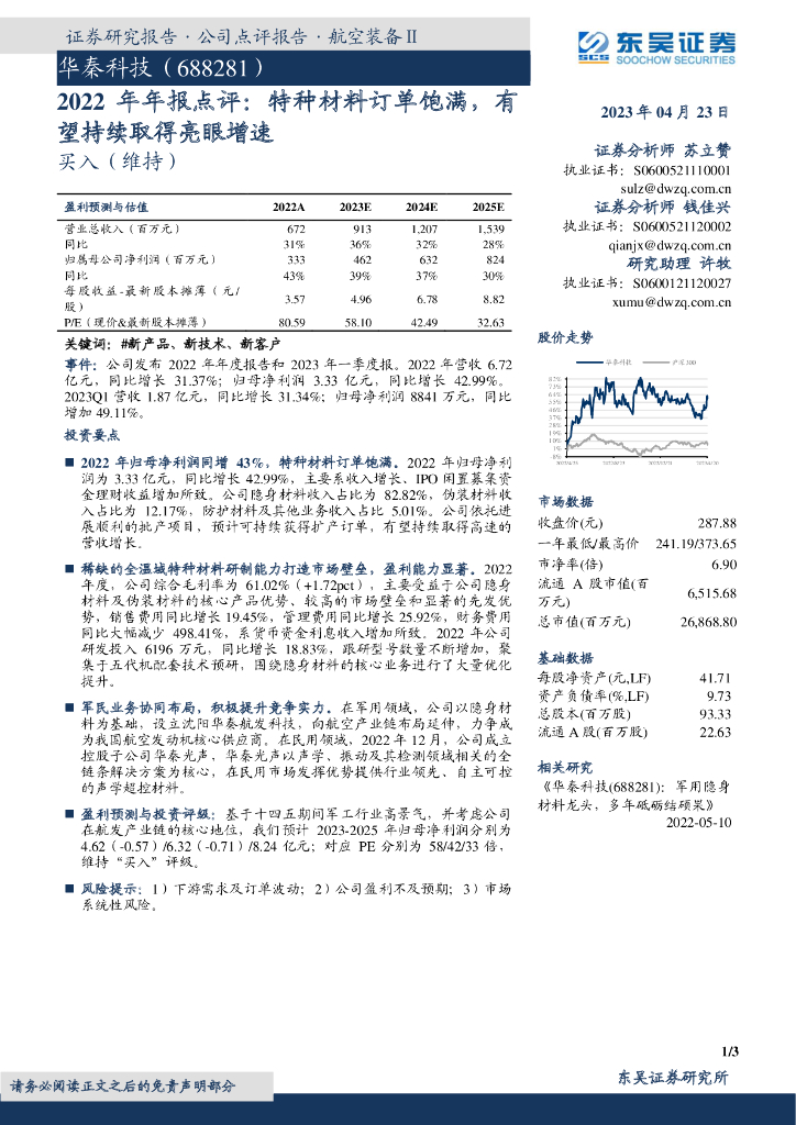 东吴证券:华秦科技(688281)-2022年年报点评:特种材料订单饱满,有望持续取得亮眼增速.pdf