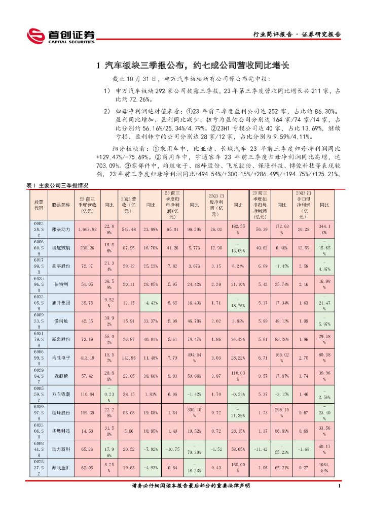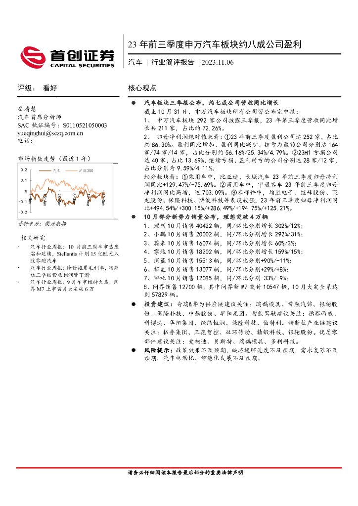 首创证券:汽车行业简评报告:23年前三季度申万汽车板块约八成公司盈利.pdf