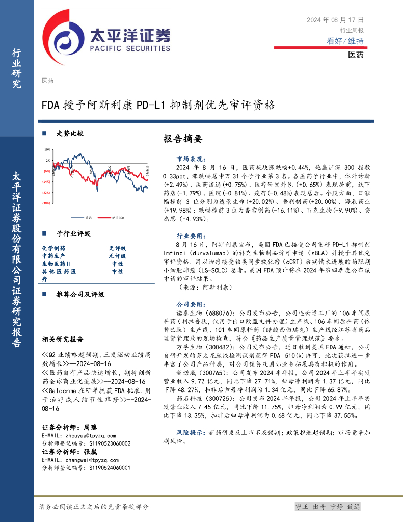 太平洋证券:医药行业周报:FDA授予阿斯利康PD-L1抑制剂优先审评资格.pdf