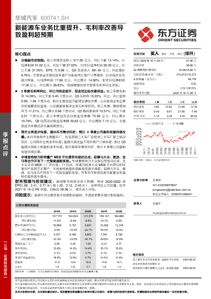 东方证券:华域汽车(600741)-新能源车业务比重提升、毛利率改善导致盈利超预期.pdf