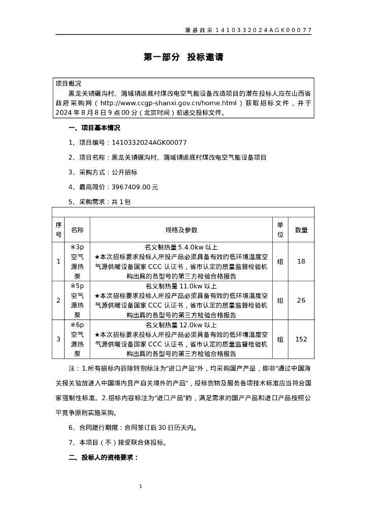 蒲县黑龙关镇碾沟村、蒲城镇返底村煤改电空气能设备项目招标文件.doc
