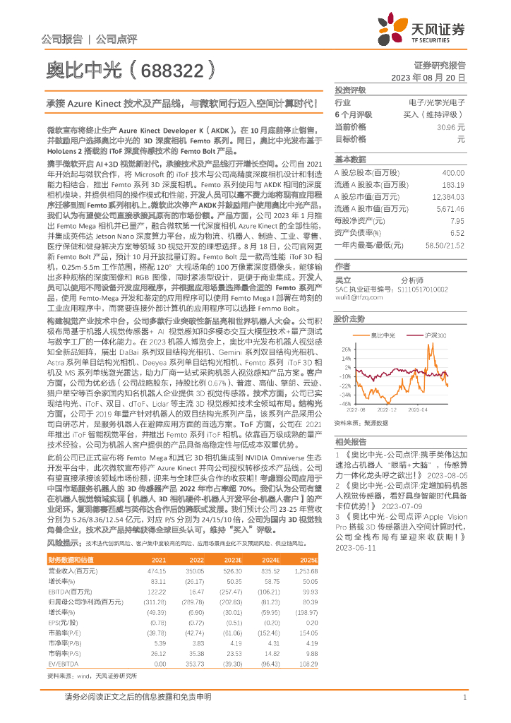 天风证券:奥比中光(688322)-承接Azure Kinect技术及产品线,与微软同行迈入空间计算时代!.pdf