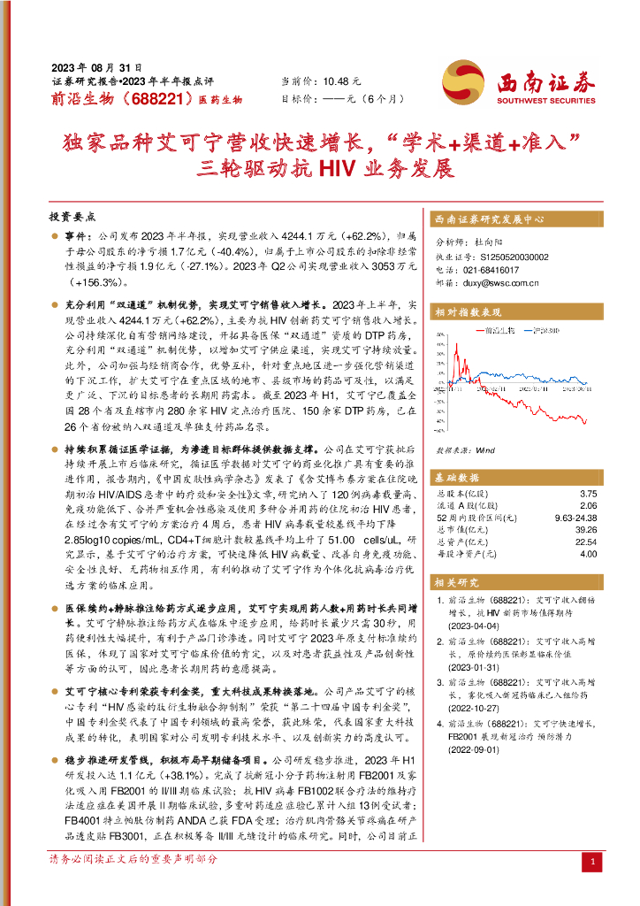 西南证券:前沿生物(688221)-独家品种艾可宁营收快速增长,“学术+渠道+准入”三轮驱动抗HIV业务发展.pdf