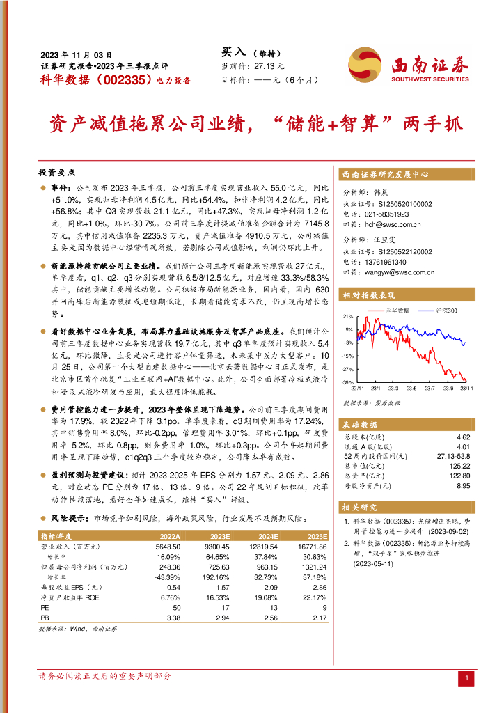西南证券:科华数据(002335)-2023年三季报点评:资产减值拖累公司业绩,“储能+智算”两手抓.pdf