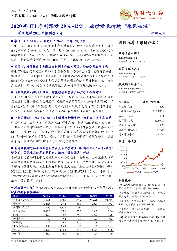 新时代证券:芒果超媒2020中报预告点评:2020年H1净利预增29%-42%,业绩增长持续“乘风破浪”.pdf