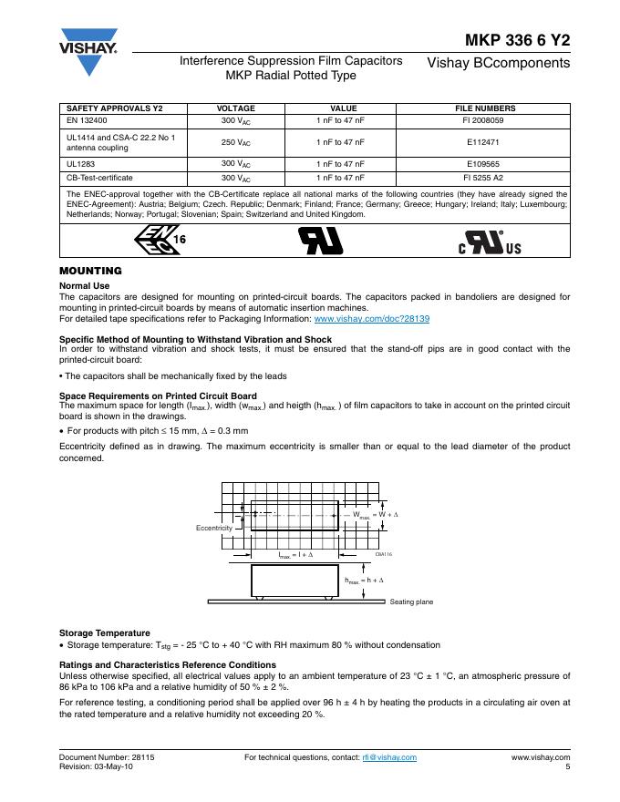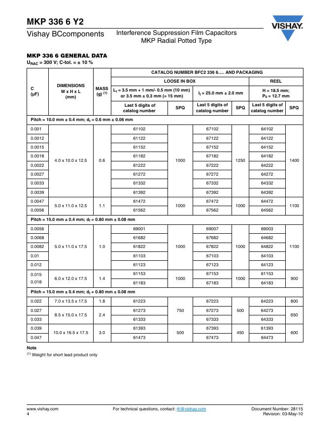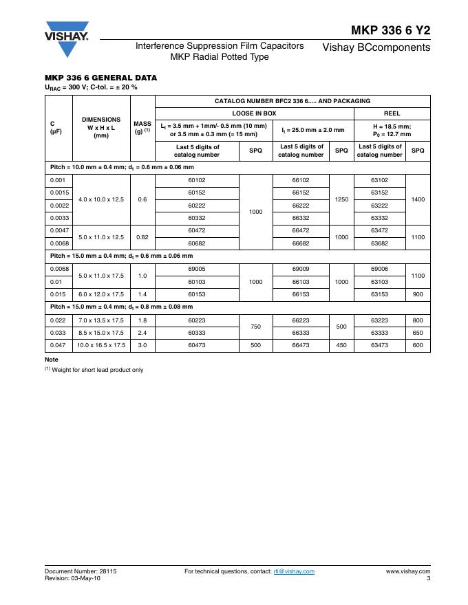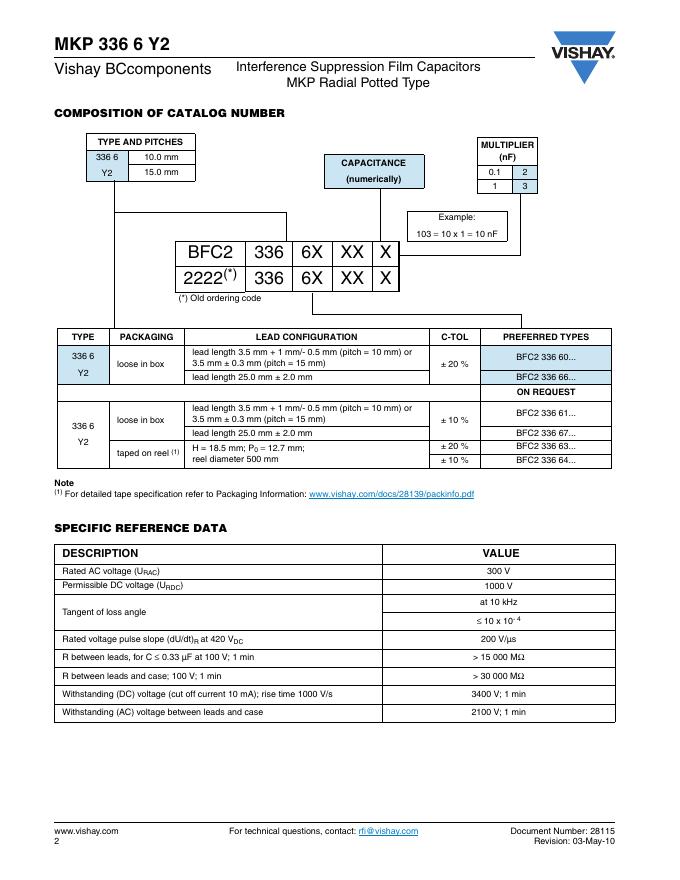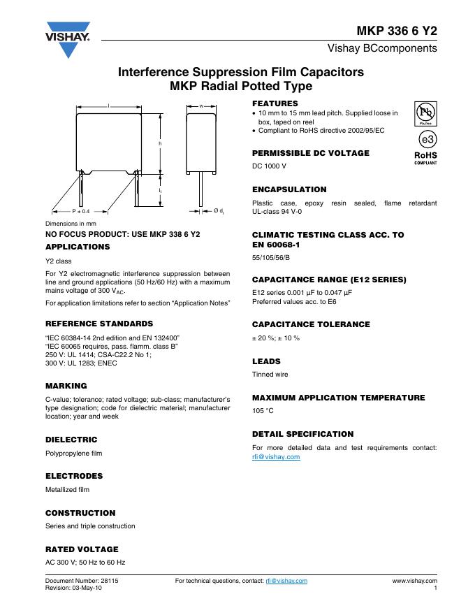 VISHAY BC COMPONENTS - MKP 336 6 Y2 Vishay BCcomponents 数据手册.pdf