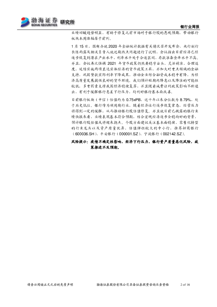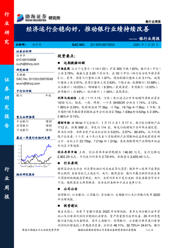 渤海证券:银行业周报:经济运行企稳向好,推动银行业绩持续改善.pdf