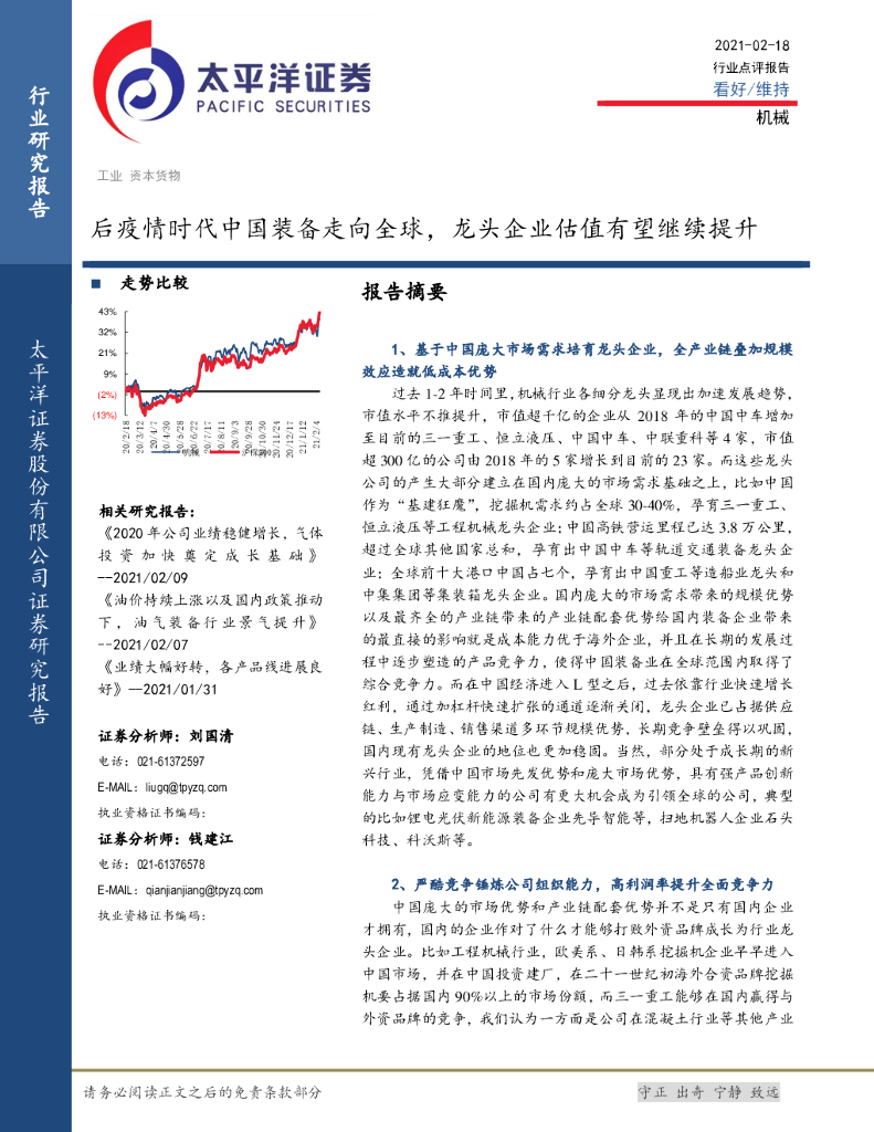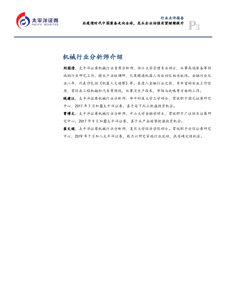 太平洋证券:机械行业点评报告:后疫情时代中国装备走向全球,龙头企业估值有望继续提升.pdf