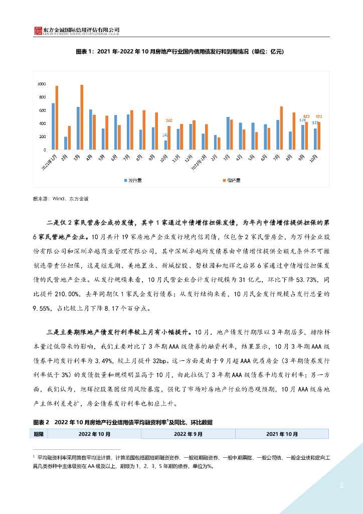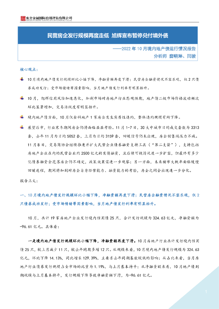 东方金诚: 2022年10月地产债运行情况报告-民营房企发行规模再度走低 旭辉宣布暂停兑付境外债.pdf