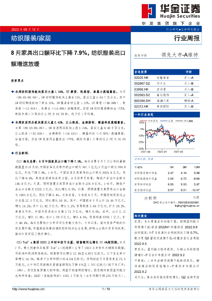 华金证券:纺织服装/家居行业周报:8月家具出口额环比下降7.9%,纺织服装出口额增速放缓.pdf