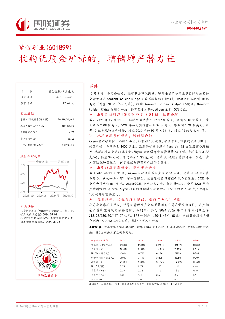 国联证券:紫金矿业(601899)-收购优质金矿标的,增储增产潜力佳.pdf