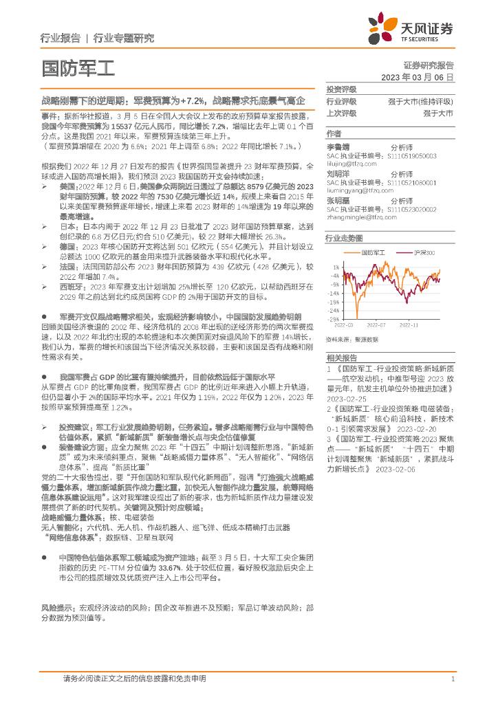 天风证券:国防军工行业专题研究:战略刚需下的逆周期:军费预算为+7.2%,战略需求托底景气高企.pdf