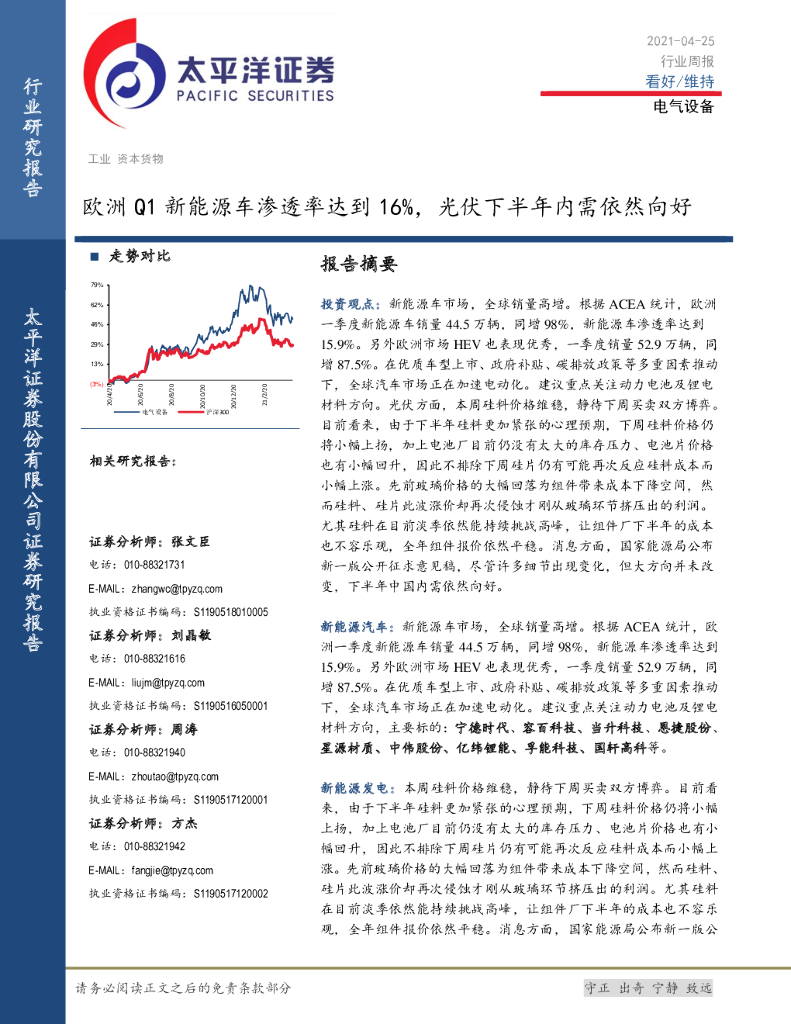 太平洋证券:电气设备行业周报:欧洲Q1新能源车渗透率达到16%,光伏下半年内需依然向好.pdf