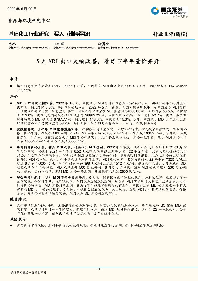 国金证券:基础化工行业研究:5月MDI出口大幅改善,看好下半年量价齐升.pdf