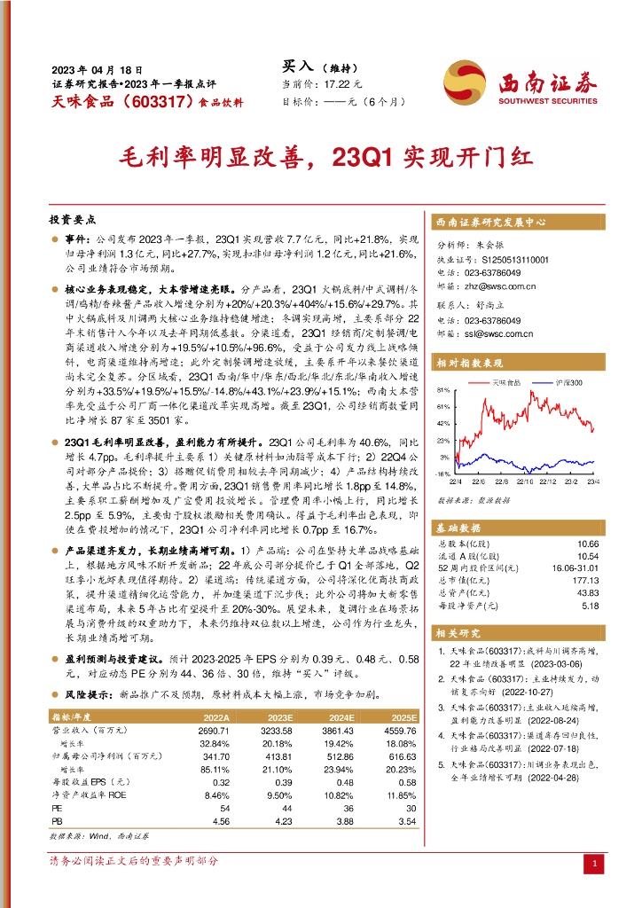 西南证券:天味食品(603317)-毛利率明显改善,23Q1实现开门红.pdf