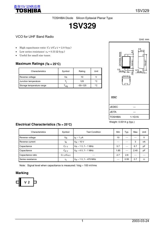 TOSHIBA Diode Silicon Epitaxial Planar Type 1SV329 数据手册.pdf