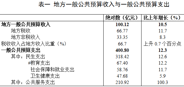 全年完成地方一般公共预算收入100.12亿元,比上年增长10.5%。其中:地方税收收入66.77亿元,增长11.7%;税收收入占地方收入的比重为66.7%,比上年提高0.7个百分点。全年完成一般公共预算支出400.80亿元,增长12.3%。其中:教育支出67.40亿元,增长12.2%;社会保障和就业支出58.76亿元,增长11.7%;卫生健康支出47.68亿元,增长5.9%。民生支出共计318.42亿元,增长12.6%,占总支出的79.4%,人均民生支出8356元。
