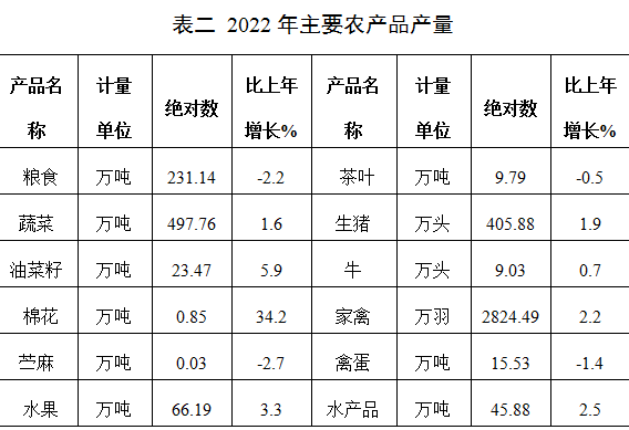全年粮食种植面积550.90万亩,比上年增长0.4%,总产量231.14万吨,下降2.2%;油料种植面积210.82万亩,增长3.0%,产量25.35万吨,增长5.7%;蔬菜种植面积201.97万亩,增长0.01%,产量497.76万吨,增长1.6%;中草药种植面积11.40万亩,增长3.3%,产量5.61万吨,下降0.2%;茶园面积50.88万亩,增长0.04%,茶叶产量9.79万吨,下降0.5%。