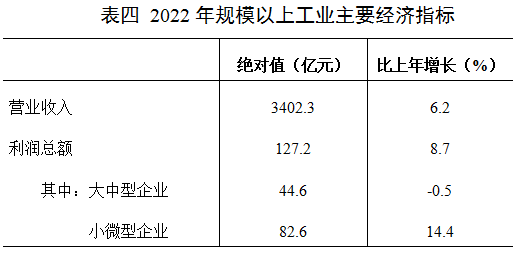 全年规模以上工业实现营业收入3402.3亿元,比上年增长6.2%;实现利润127.2亿元,增长8.7%,其中:九大主要行业实现利润110.2亿元,占全部规模以上工业的86.7%。
