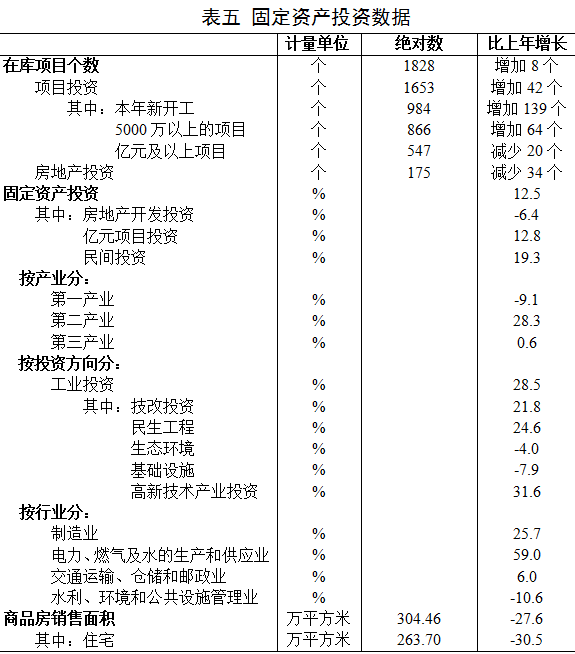 全年固定资产投资比上年增长12.5%,增速高于全省平均水平5.9个百分点。从经济类型看:国有投资下降3.9%,非国有投资增长23.3%,民间投资增长19.3%。按三次产业分:第一产业投资下降9.1%,二、三产业投资分别增长28.3%、0.6%,三次产业投资比重由3.8:44.3:51.9调整为3.0:50.6:46.4。从投资方向看:工业投资增长28.5%;工业技改投资增长21.8%;高技术产业投资增长31.6%;民生工程投资增长24.6%;生态环境投资下降4.0%;基础设施投资下降7.9%。