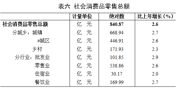全年实现社会消费品零售总额840.87亿元,比上年增长2.6%。分地域看,城镇实现零售额668.94亿元,乡村实现零售额171.93亿元,分别增长2.7%和2.3%。分行业看,批发业实现零售额101.85亿元,增长2.9%;零售业实现零售额538.86亿元,增长2.6%;住宿业实现零售额30.17亿元,增长2.0%;餐饮业实现零售额169.99亿元,增长2.7%。