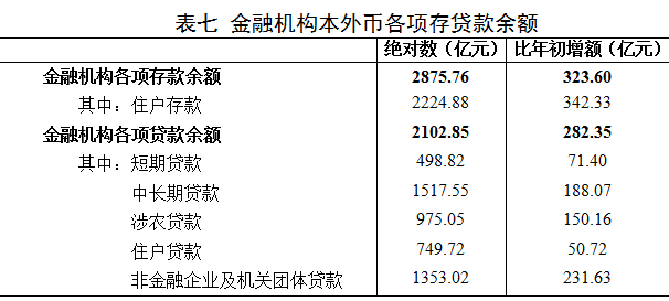 年末金融机构本外币各项存款余额2875.76亿元,比年初增加323.60亿元。其中:住户存款余额2224.88亿元,比年初增加342.33亿元。金融机构本外币贷款余额2102.85亿元,比年初增加282.35亿元。金融机构存贷比为73.1%,比上年末提高1.8个百分点。从贷款分类看,中长期贷款1517.55亿元,比年初增加188.07亿元;短期贷款498.82亿元,比年初增加71.40亿元;涉农贷款975.05亿元,比年初增加150.16亿元;住户贷款749.71亿元,比年初增加50.72亿元;非金融企业及机关团体贷款1352.18亿元,比年初增加231.74亿元。