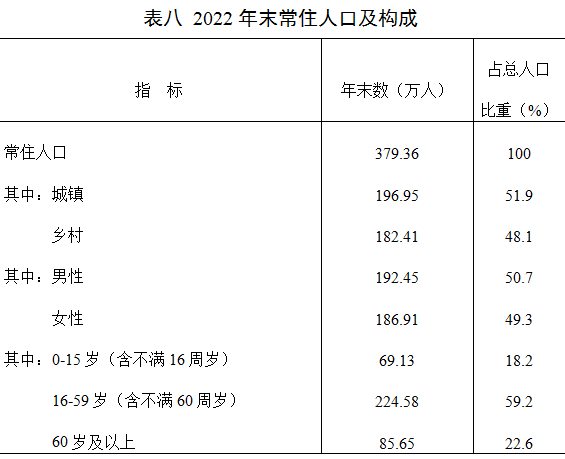 全市年末常住人口379.36万人,比上年减少3.42万人。其中:城镇人口196.95万人,城镇化率51.9%,比上年提高0.68个百分点。0—15岁(含不满16周岁)人口占常住人口的比重为18.2%,下降0.3个百分点;16—59岁(含不满60周岁)人口比重为59.2%,提高0.02个百分点;60岁及以上人口比重为22.6%,提高0.3个百分点。