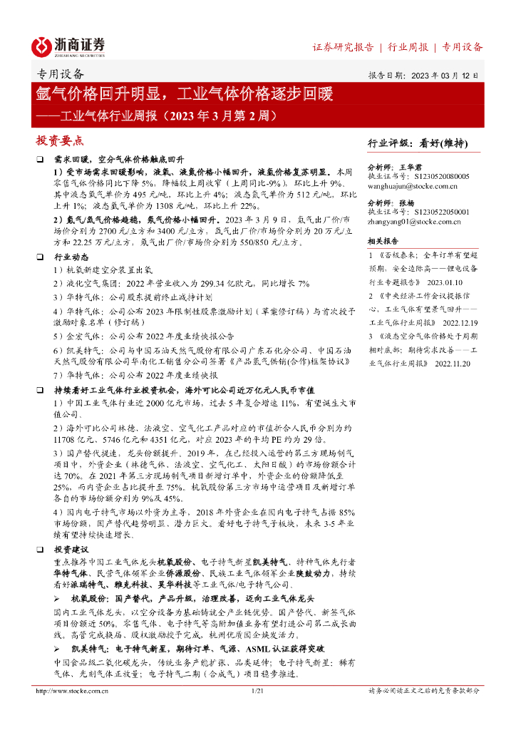 浙商证券:工业气体行业周报(2023年3月第2周):氩气价格回升明显,工业气体价格逐步回暖.pdf