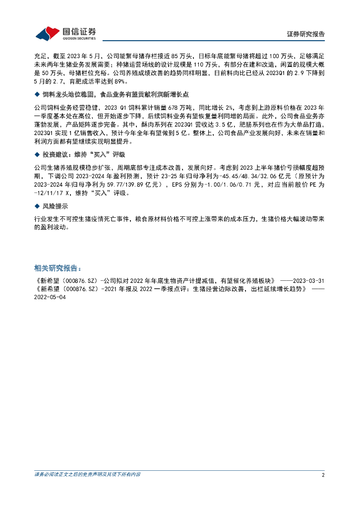 国信证券:新希望(000876)-2023半年报业绩预告点评:2023Q2亏损预计11.04-13.04亿元,环比2023Q1明显减亏.pdf