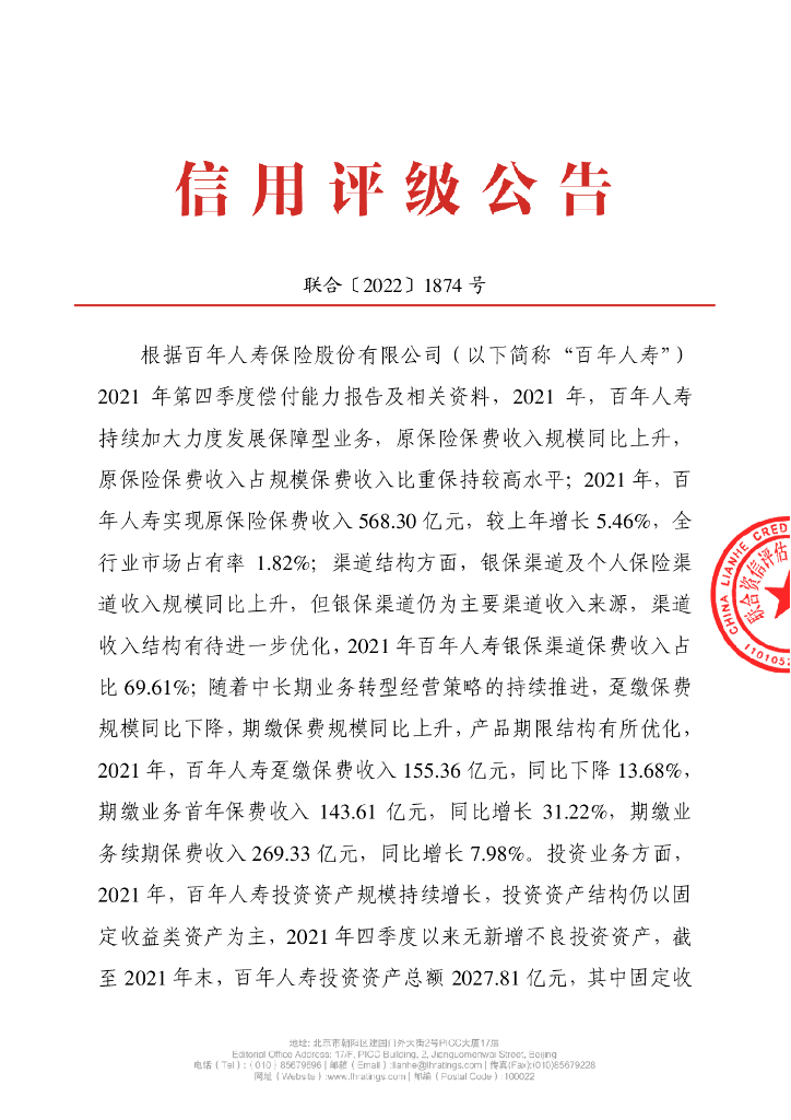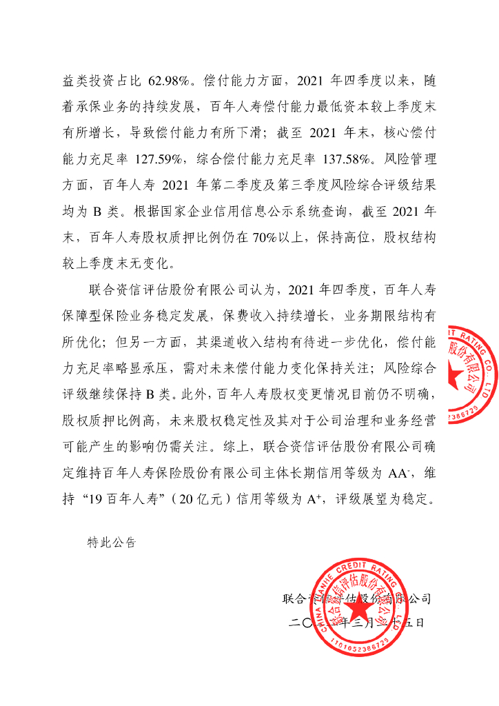 联合资信:百年人寿保险股份有限公司2022年一季度跟踪公告.pdf