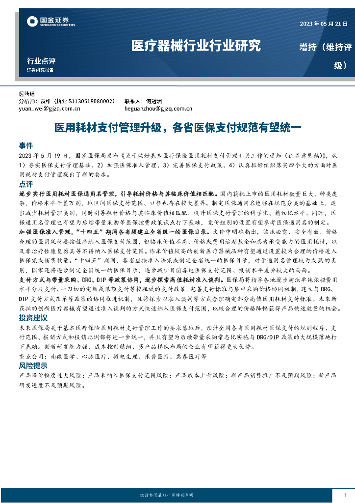 国金证券:医疗器械行业行业研究:医用耗材支付管理升级,各省医保支付规范有望统一.pdf