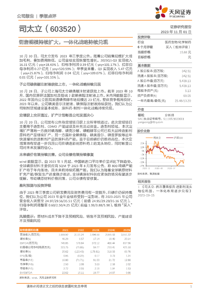 天风证券:司太立(603520)-销售规模持续扩大,一体化战略持续兑现.pdf
